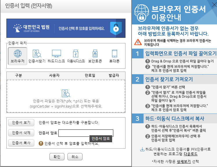 마지막으로 조회 버튼을 클릭하면 공인인증서를 이용해서 인증을 하게 되는데 미리 준비해놓은 공인인증서를 이용하여 인증을 하면 됩니다.