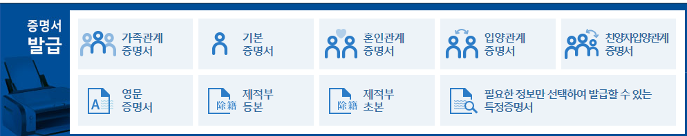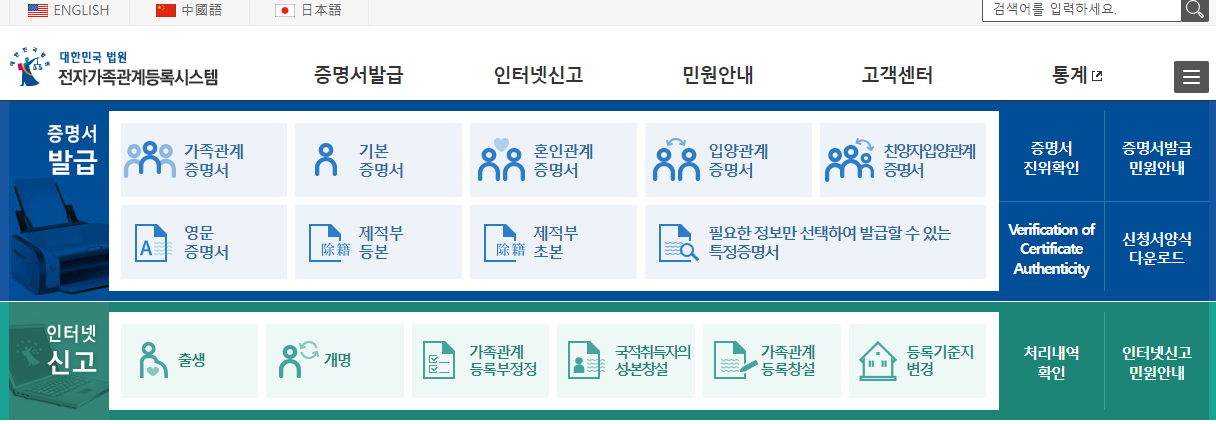 증명서 발급 메뉴에는 가족관계증명서, 기본증명서, 혼인관계증명서 등이 있고 인터넷 신고 메뉴에는 출생, 개명등의 메뉴들이 보입니다.