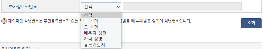 추가정보 확인은 부, 모, 배우자, 자녀 성명, 등록기준지 다섯가지 중에서 하나를 선택하면 됩니다.