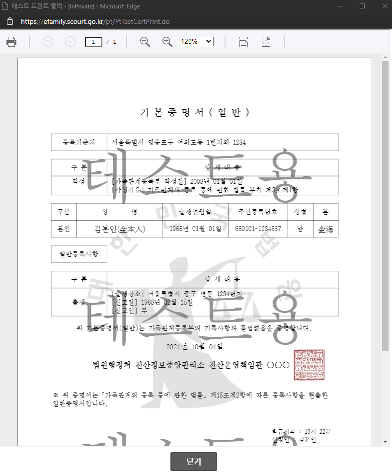 테스트 증명서 출력 버튼을 클릭하면 테스트용 문서가 열리게 됩니다.