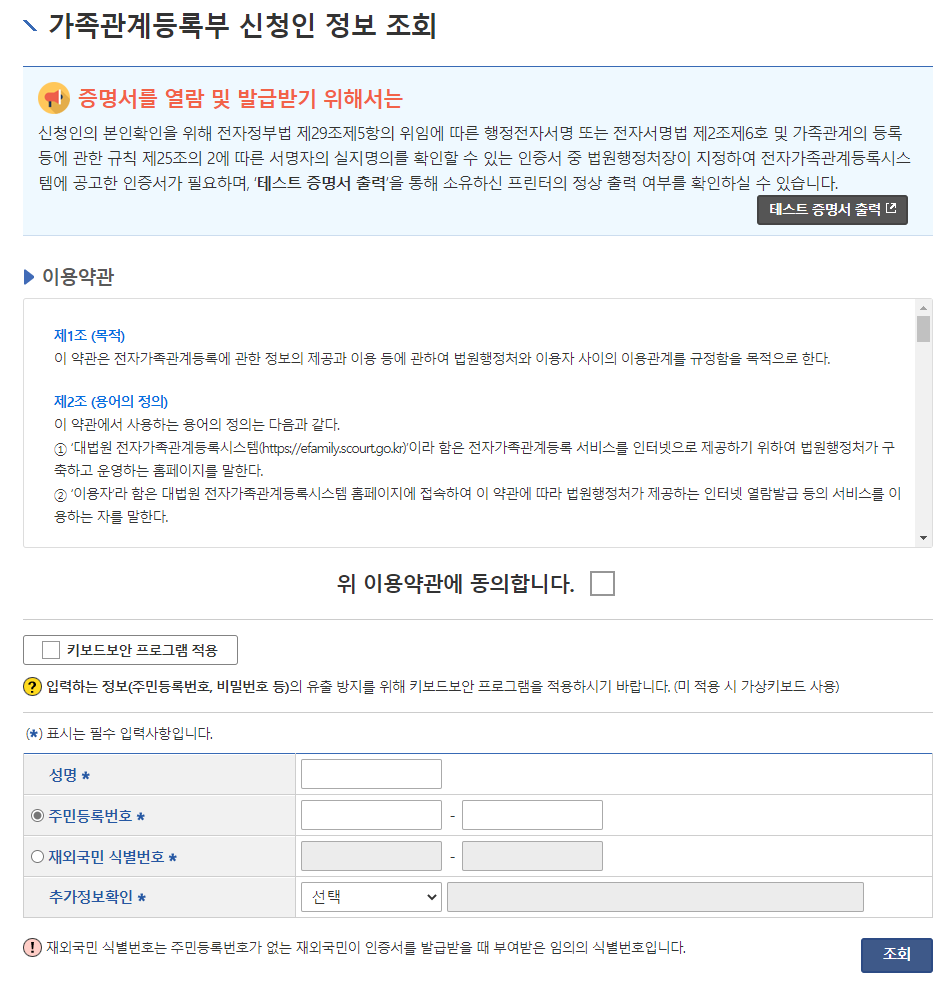 가족관계증명서 인터넷발급을 위해서는 먼저 테스트 증명서 출력을 해보셔야 합니다. 테스트 증명서 출력을 클릭하면 현재 본인이 소유하고 있는 프린터로 가족관계증명서가 출력이 가능한지 확인할 수 있습니다.