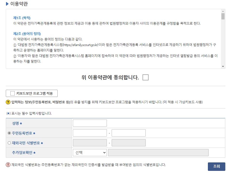 출력의 되는 것을 확인하셨으면 이제 약관에 동의를 하신후 아래쪽에 성명, 주민등록번호, 추가 정보를 입력 후 조회 버튼을 클릭하시면 됩니다.