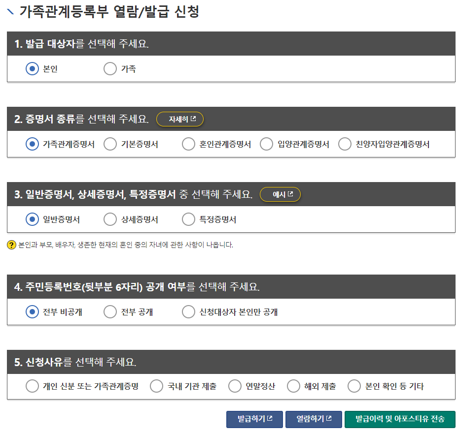 인증을 하고나면 가족관계증명서 인터넷발급 신청서를 작성하게 됩니다.