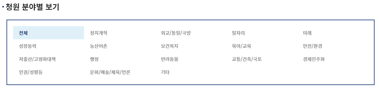 조금 더 아래로 내려가시면 분야별 청원을 확인할 수 있습니다.