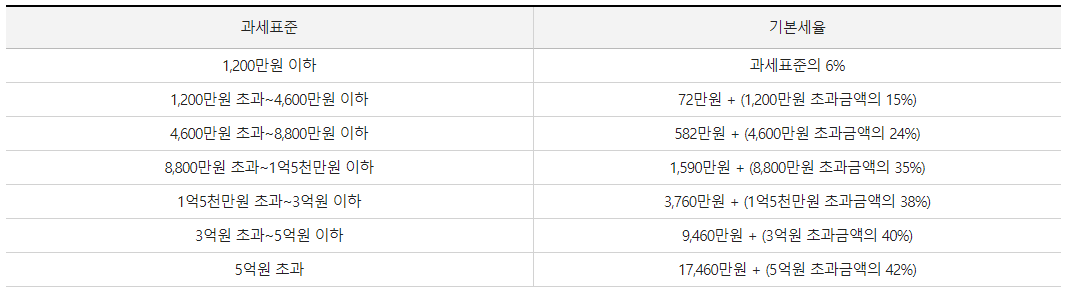 과세표준 1,200만원 이하는 과세표준의 6%, 1,200만원 초과 4,600만원 이하는 기본 세율이 72만원 + 1,200만원 초과금액의 15%, 4,600만원 초과 8,800만원 이하는 582만원 + 4,600만원 초과금액의 24%, 8,800만원 초과 1억 5천만원 이하는 1,690만원 + 8,800만원 초과금액의 35%, 1억 5천만원 초과 3억원 이하는 3,760만원 + 1억5천만원 초과금액의 38%, 3억원 초과 5억원 이하는 9,460만원 + 3억원 초과금액의 40%, 5억원 초과는 17,460만원 + 5억원 초과금액의 42% 입니다.
