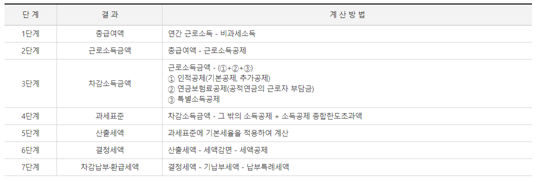 근로소득 세율 구간이 처음 보시는 분들은 복잡하실 수가 있는데 위에서 설명드린 것은 1단계, 2단계까지만 계산 후 바로 과세표준을 계산한 것입니다. 1단계, 2단계 말고도 차감소득금액, 과세표준, 결정세액, 차감납부 환금세액 등의 절차를 더 거치시면 실제로 납부해야하는 근로소득금액은 더 줄어들게 됩니다.