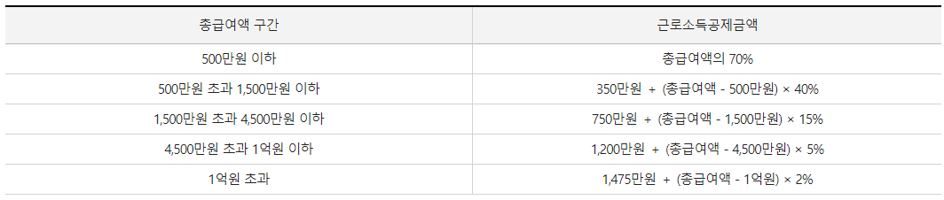 그리고 근로소득금액은 총급여에서 근로소득 공제금액을 차감한 금액을 말하는데 근로소득공제금액은 위 표와 같이 총급여액 구간에 따라 공제 비율이 차등 적용되며 공제한도는 2,000만원입니다.