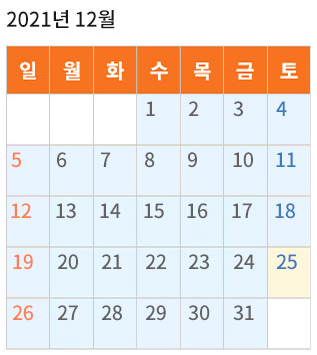 A는 분홍색, B는 살구색, C는 파란색입니다. 위 표는 2021년 1월 설정되어 있는 달력입니다.