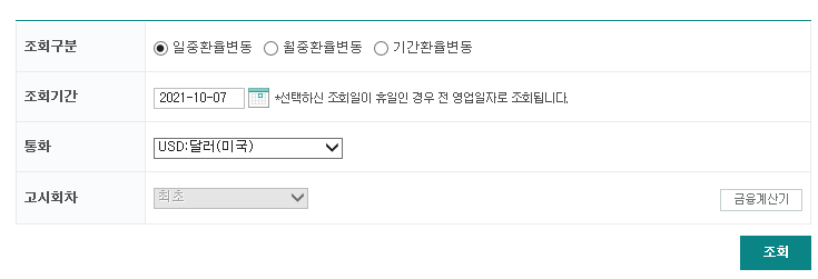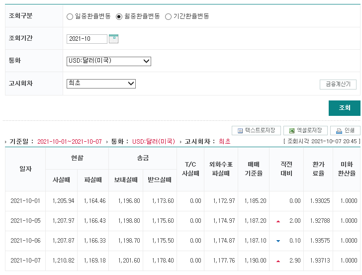 2021년 10월, 달러를 선택 후 조회를 해보았습니다. 10월 1일부터 10월 7일까지 일자변 환율을 확인할 수 있습니다.