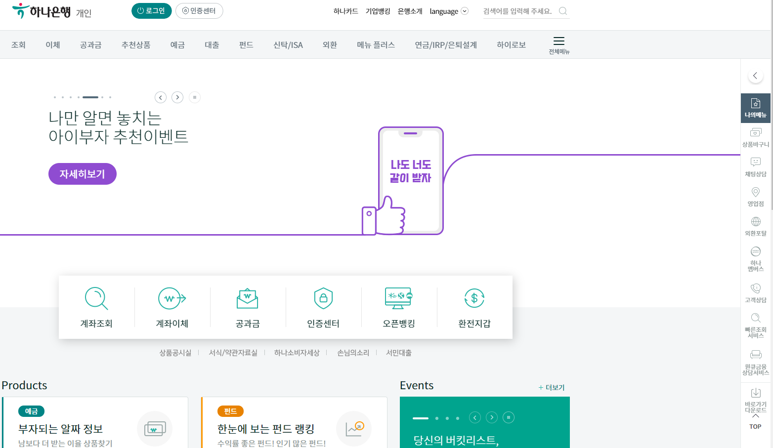 하나은행 홈페이지에 접속하시면 여러가지 메뉴들이 보일 것입니다.