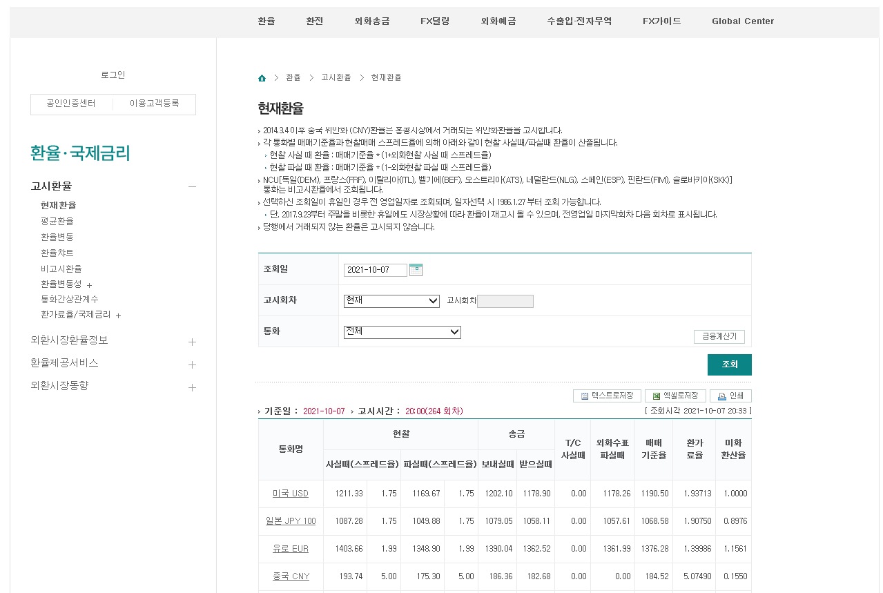 바로 화면 아래쪽을 보시면 현재인 2021년 10월 7일 환율을 확인할 수 있고 달러기준 매매기준율이 1190.50, 엔화 기준 매매기준율이 1068.58, 유로화 기준 매매기준율이 1376.28, 위안화 기준 184.52입니다.