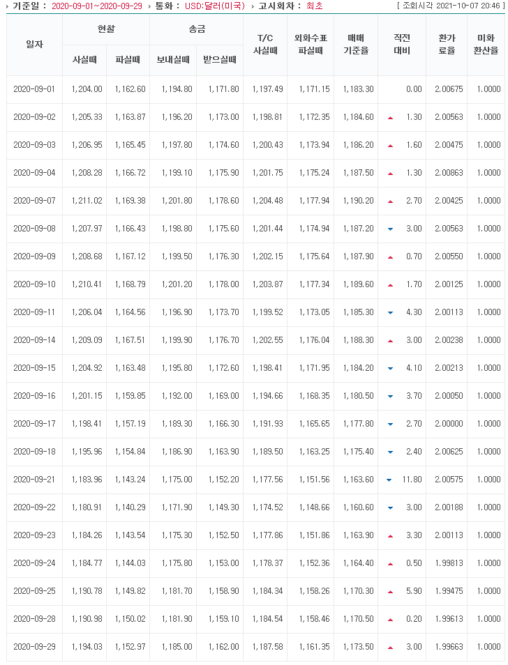 달러기준 2020년 9월 1일은 매매기준율이 1183.3원 9월 29일은 1173.50원입니다. 일자별 과거 환율조회를 해보시고 싶은 분들은 위 방법을 이용해서 조회 하시기 바랍니다.