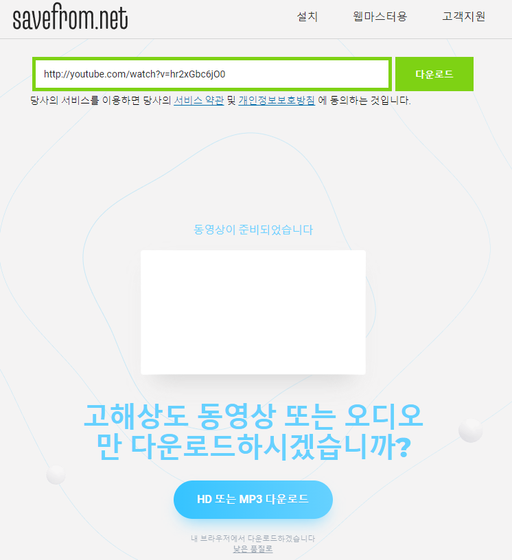 주소창에 다운로드 받을 유튜브 동영상의 주소를 복하사셔서 붙여넣으시면 됩니다.