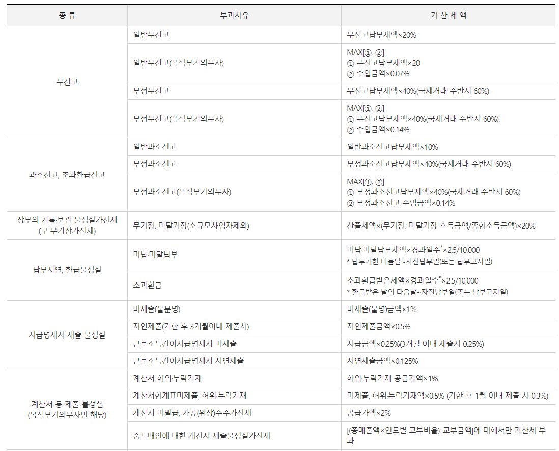 무신고, 과소신고, 초과환급신고, 납부지연, 환급 불성실, 지급 명세서 불성실,