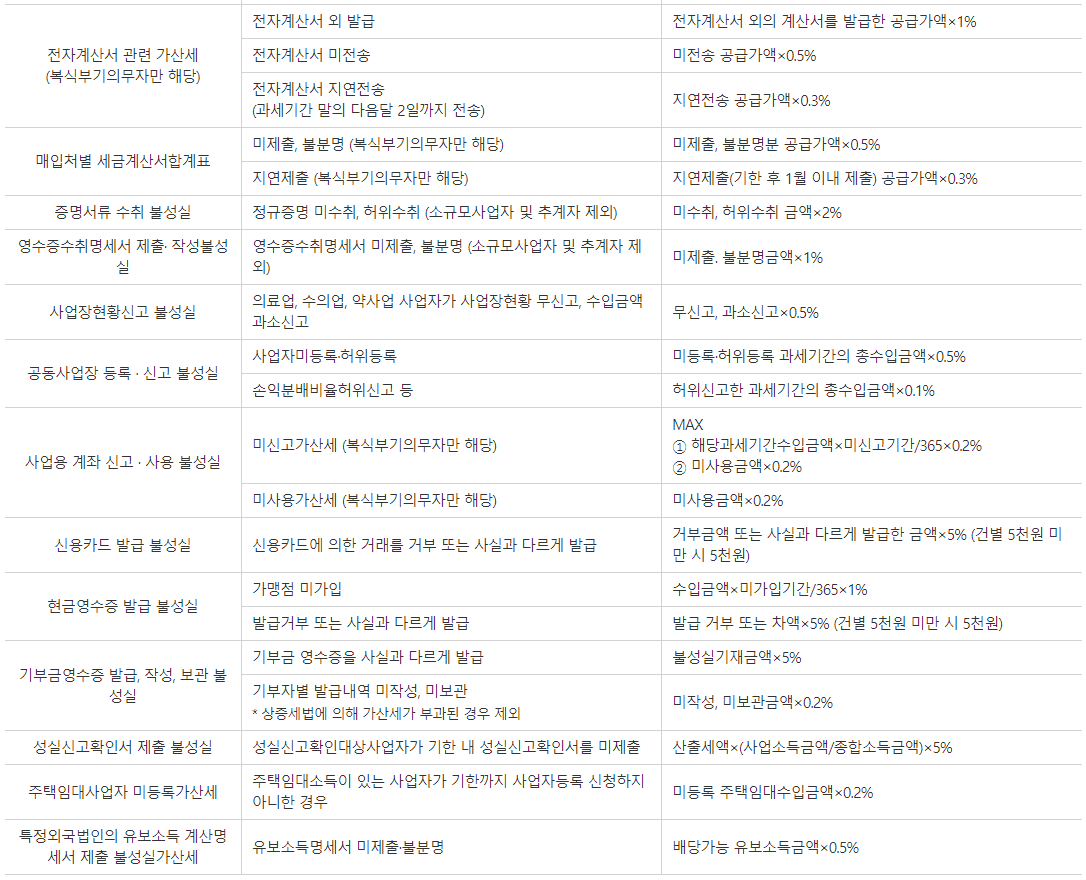 현금영수증 발급 불성실, 사업용 계좌 신고 사용 불성실 등 여러가지 가산세가 있으니 참고하시기 바랍니다.