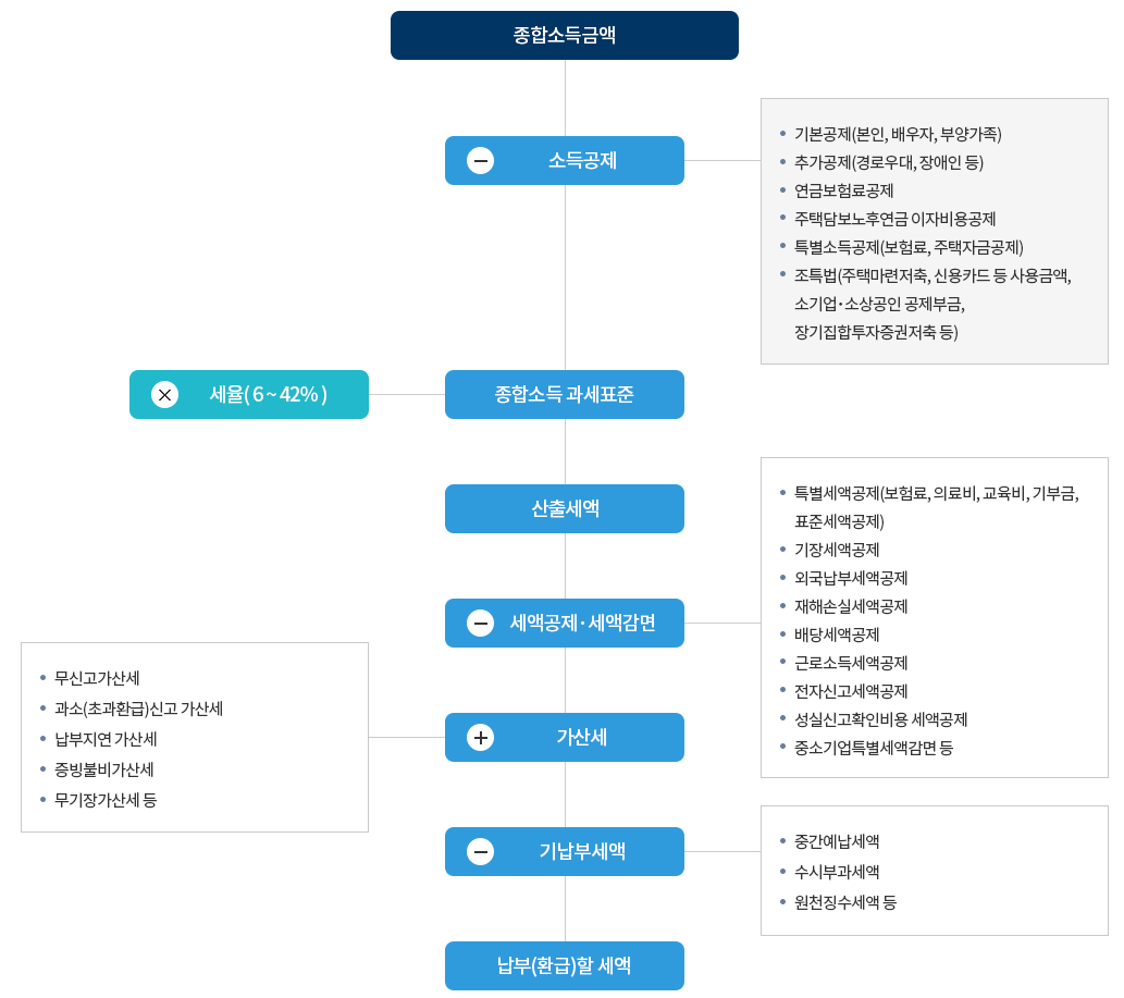 종합소득세는 계산된 액에서, 세액 공제, 세액감면 등으로 인해서 줄어들 수가 있습니다. 그러나 만약에 무신고하거나, 납부지연하거나, 과소신고 등을 할 경우 가산세가 추가될 수가 있습니다.