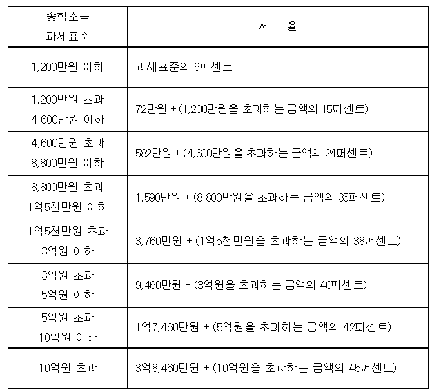 이전 종합소득세율과 차이점이 느껴지시나요. 바로 최고세율이 45%가 되었습니다. 차이점만 설명 드리면 5억원 초과 10억원 이하는 42%, 10억원 초과는 종합소득세율이 45% 입니다.