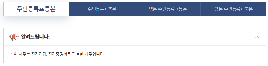 비회원 또는 회원으로 로그인을 하면 맨 위쪽에 주민등록표등본이 선택되어 있을 것입니다.