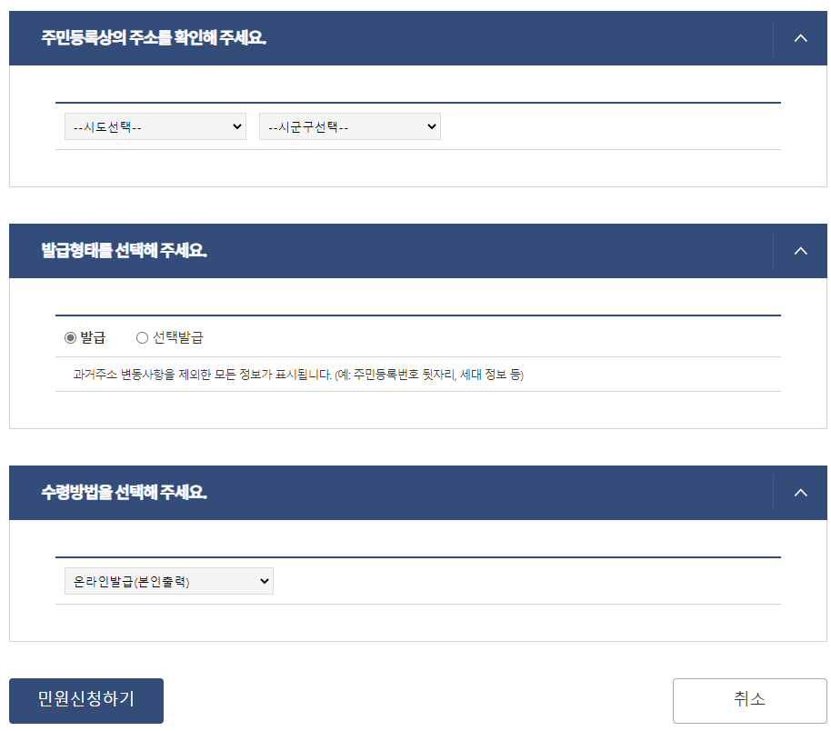 주민등록상의 주소를 확인하고, 발급형태를 선택하고 맨 아래쪽에 있는 민원 신청하기 버튼을 클릭하면됩니다.