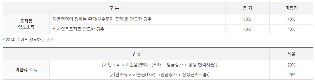 그리고 토지 등 양도소득, 미환류 소득의 세율입니다. 토지등 양도소득은 대통령령이 정하는 주택은 등기 10%, 미등기 40%, 비사업용 토지를 양도한 경우 등기 10%, 미등기 40%입니다. 미환류 소득은 세율이 20%입니다.