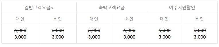 일반고객은 대인 15,000원, 소인 10,000원, 숙박고객은 대인 8,000원, 소인 5,000원, 여수시민은 대인 10,500원, 소인 7,000원입니다. 소인은 13세까지입니다.