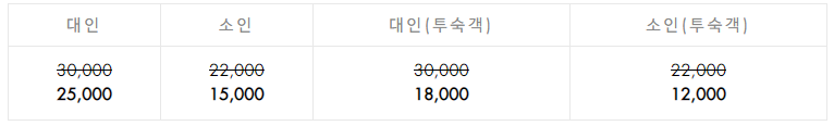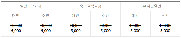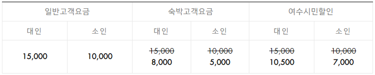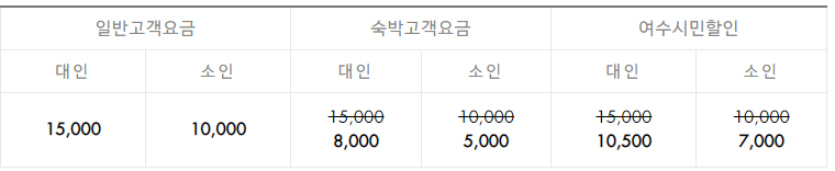 일반고객은 대인 15,000원, 소인 10,000원, 숙박고객은 대인 8,000원, 소인 5,000원, 여수시민은 대인 10,500원, 소인 7,000원입니다. 소인은 13세까지입니다.
