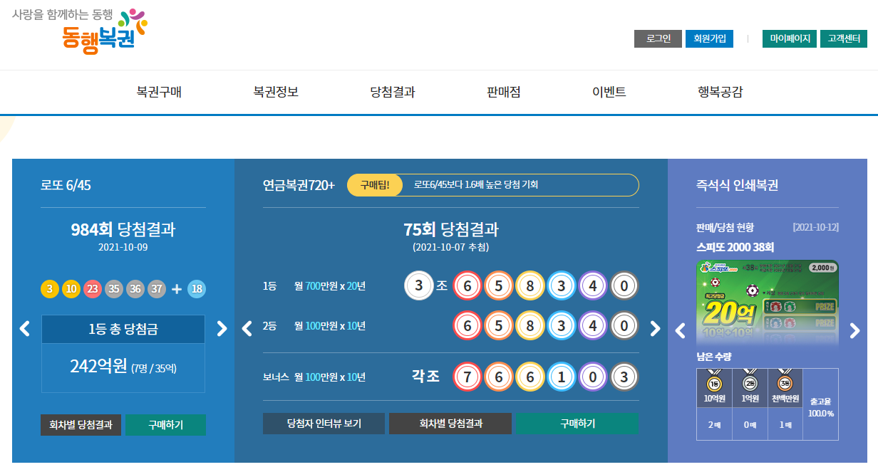 동행복권 홈페이지에서는 로또복권뿐만아니라 연금복권도 구매하실 수가 있으니 관심있는 분들은 동행복권 홈페이지 접속해보시기 바랍니다.