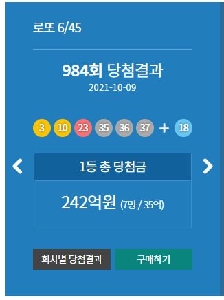 먼저 2021년 10월 9일 로또 당첨 결과가 보입니다.