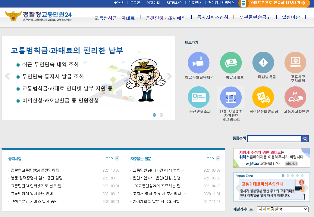 홈페이지 오른쪽 바로가기 메뉴를 보시면 최근 무인단속내역, 미납 과태료, 미납 범칙금 등이 보일 것입니다.