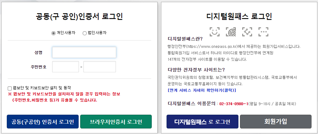 성명과 주민등록번호를 입력 후 공동인증서를 이용해서 인증하시면 됩니다.