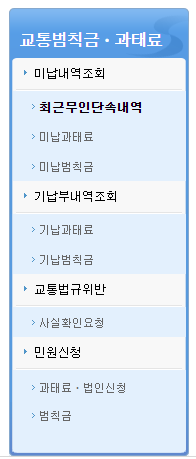 홈페이지 오른쪽 바로가기 메뉴를 보시면 최근 무인단속내역, 미납 과태료, 미납 범칙금 등이 보일 것입니다.