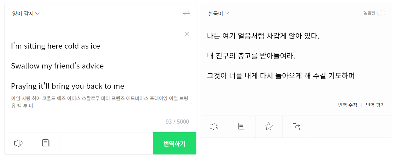 i'm sitting here cold as ice, swallow my friend's advice, praying it'll bring you back to me 를 입력하니 '나는 여기 얼음처럼 차갑게 앉아 있다. 내친구의 충고를 받아들여라. 그것이 너를 내게 돌아오게 해주길 기도하며로 번역됩니다.
