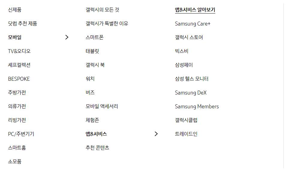 여기서 삼성 스마트스위치 pc 버전을 다운로드 받으려면 앱&서비스 메뉴를 이용하여야 하는데 앱&서비스는 제품 메뉴 안에 있습니다.