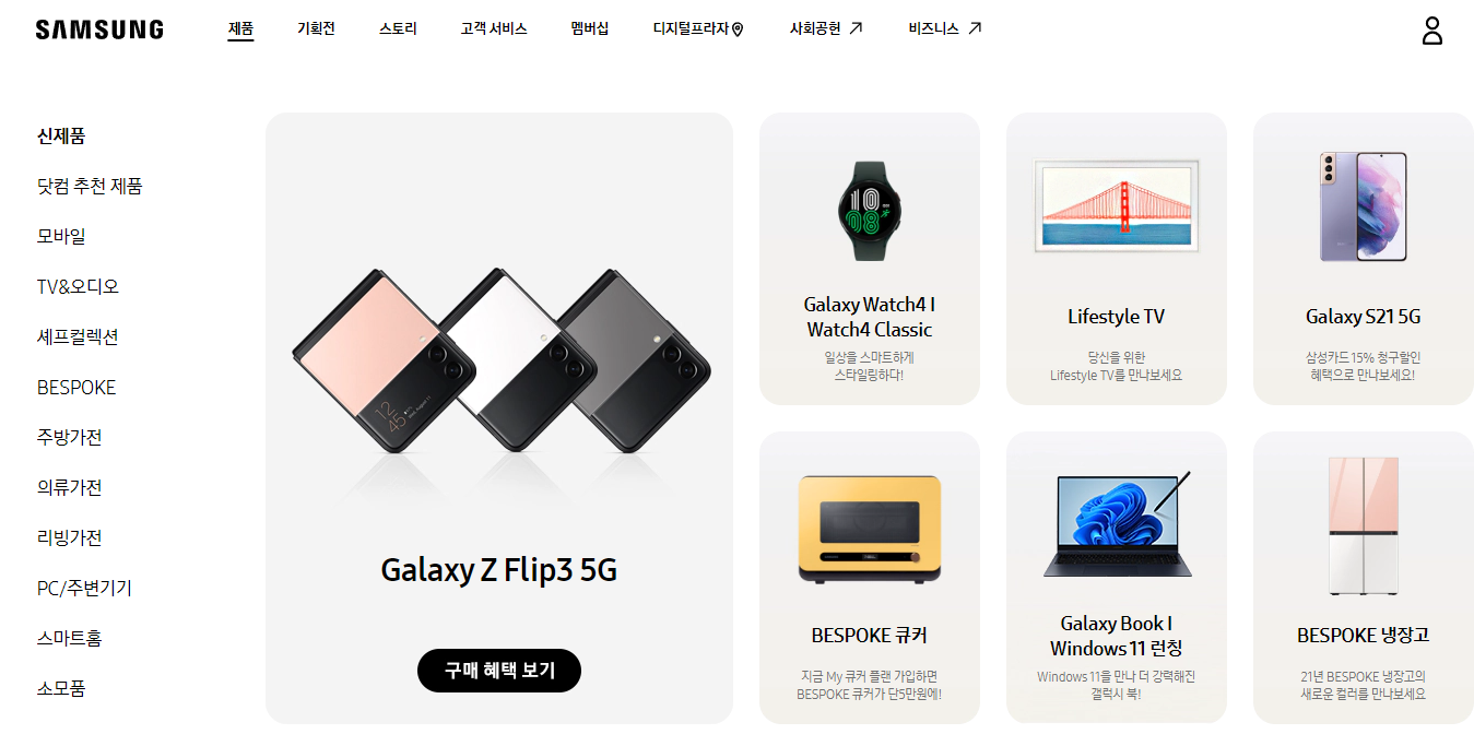 삼성전자 홈페이지 위쪽을 보면 제품, 스토리, 고객서비스, 디지털 프라자 등이 보일 것입니다.
