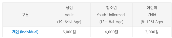 먼저 성인은 만 19세 이상 64세 이하를 말하며 개인기준 6,000원, 청소년은 13세 이상 18세 이하를 말하고 4,000원, 어린이는 8세 이상 12세 이하를 말하고 3,000원입니다.