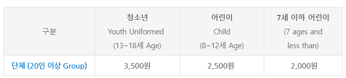 단체 요금은 청소년, 어린이, 7세 이하 어린이만 적용 되는데 13세 이상 18세 이하 청소년은 20인 이상일 경우 3,500원, 8세 이상 12세 이하 어린이는 2,500원, 7세 이하 어린이는 2,000원입니다.
