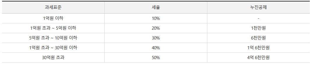 증여세율은 5구간으로 이루어져 있는데 과세표준 1억원 이하는 10%, 1억원 초과 5억원 이하는 증여세율이 20%, 5억원 초과 10억원 이하는 증여세율이 30%, 10억 초과 30억 이하는 증여세율이 40%, 30억원 초과는 50%입니다.
