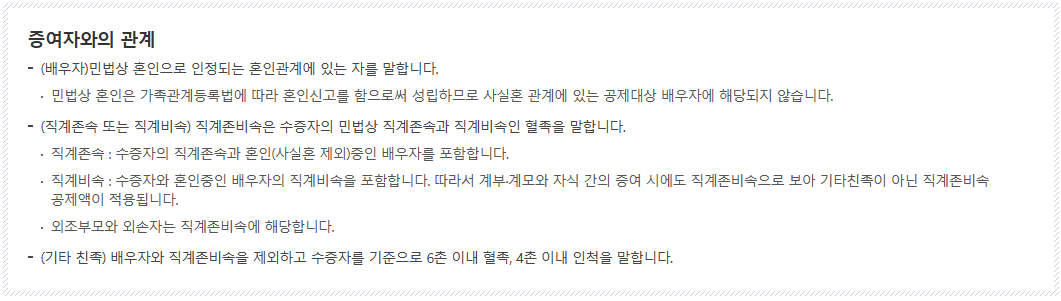 배우자는 증여세 면제 한도액이 6억원이라고 설명드렸지만 민법상 혼인으로 인정되는 혼인관계에 있는 자를 말하는데 가족관계등록법에 따라 혼인신고를 하지 않고 사실혼 관계에 있는 경우 공제대상 배우자에 해당하지 않습니다.