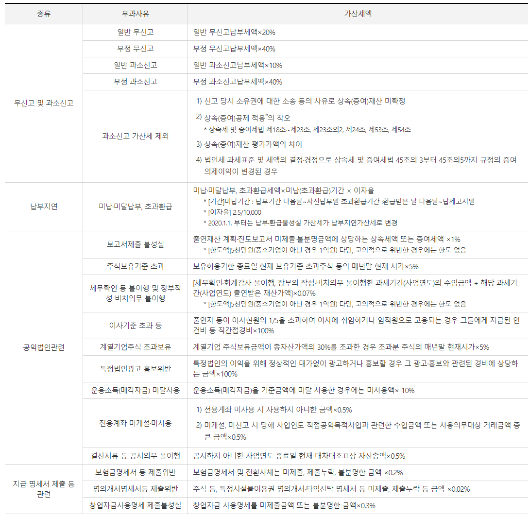가산세가 과세되는 경우는 여러가지가 있는데 대표적으로 무신고, 과소신고, 납부지연, 공익법인 관련, 지급 명세서 제출 등 관련입니다.