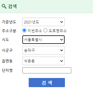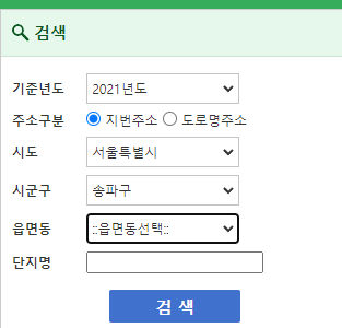읍면동까지는 선택하지 않으셔도 됩니다. 선택을 하셨으면 이제 아래쪽에 보이는 검색버튼을 클릭하여야 합니다. 읍면동도 선택을 하셔도 되는데 저는 선택을 안하고 검색 버튼을 클릭하겠습니다.