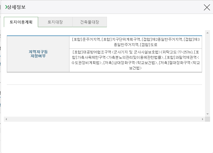 보기버튼을 클릭하면 지역 지구등 지정여부, 용적율 건페율 등을 확인하실 수 있습니다.