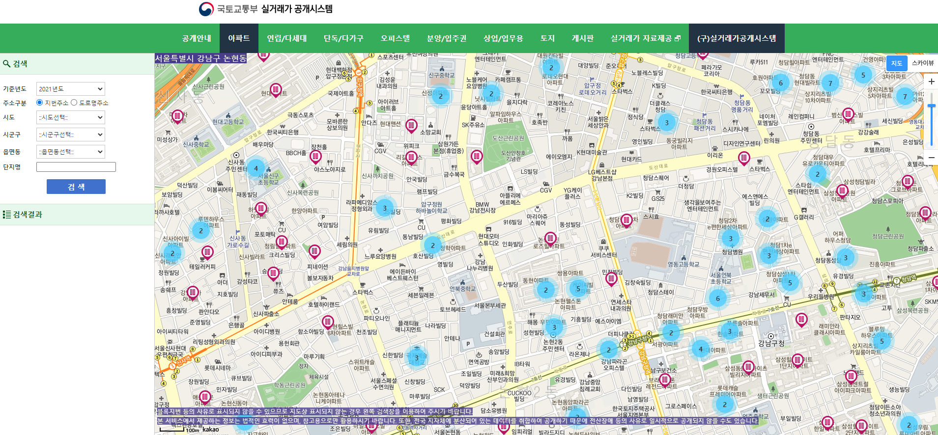 아파트를 클릭하면 오른쪽에 지도가 보이고 왼쪽에는 검색 버튼들이 보일 것입니다.