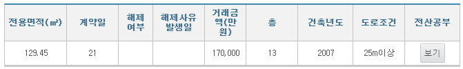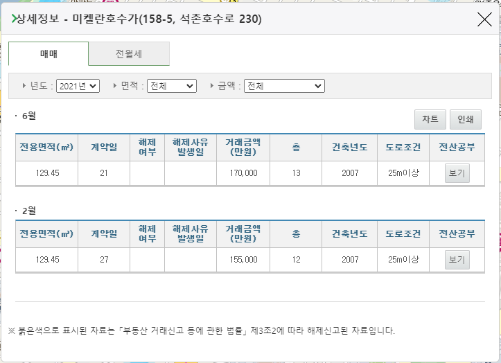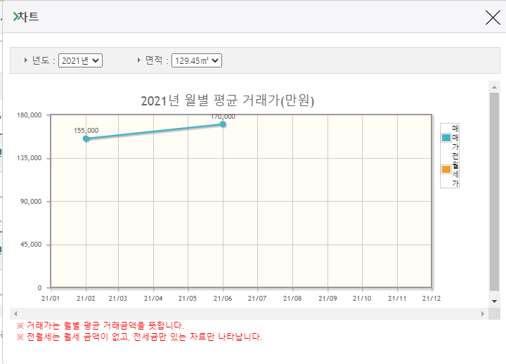 제가 클릭한 곳은 실거래가가 2021년도 매매 기준으로 6월 전용면적 129.45 170,000만원, 2월 155,000만원입니다.
