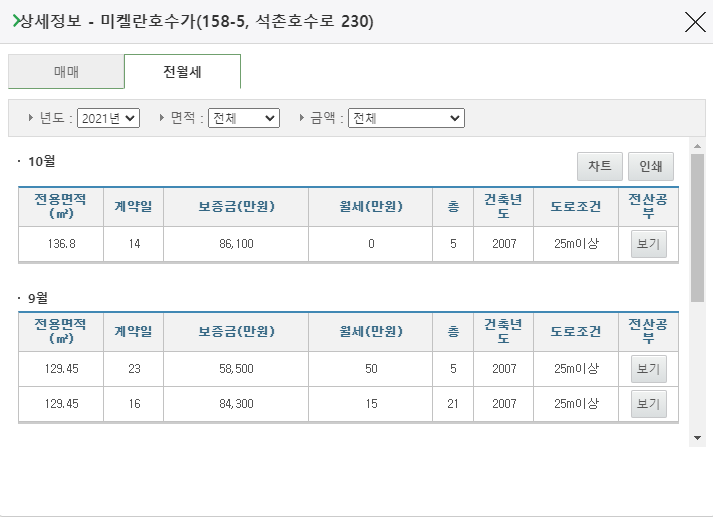 2021년도 기준 10월은 전용면적 136.8 보증금 86,100만원, 9월은 전용면적 129.45 보증금 58,500만원, 월세 50만원, 전용면적 129.45 보증금 84,300만원, 월세 15만원입니다.