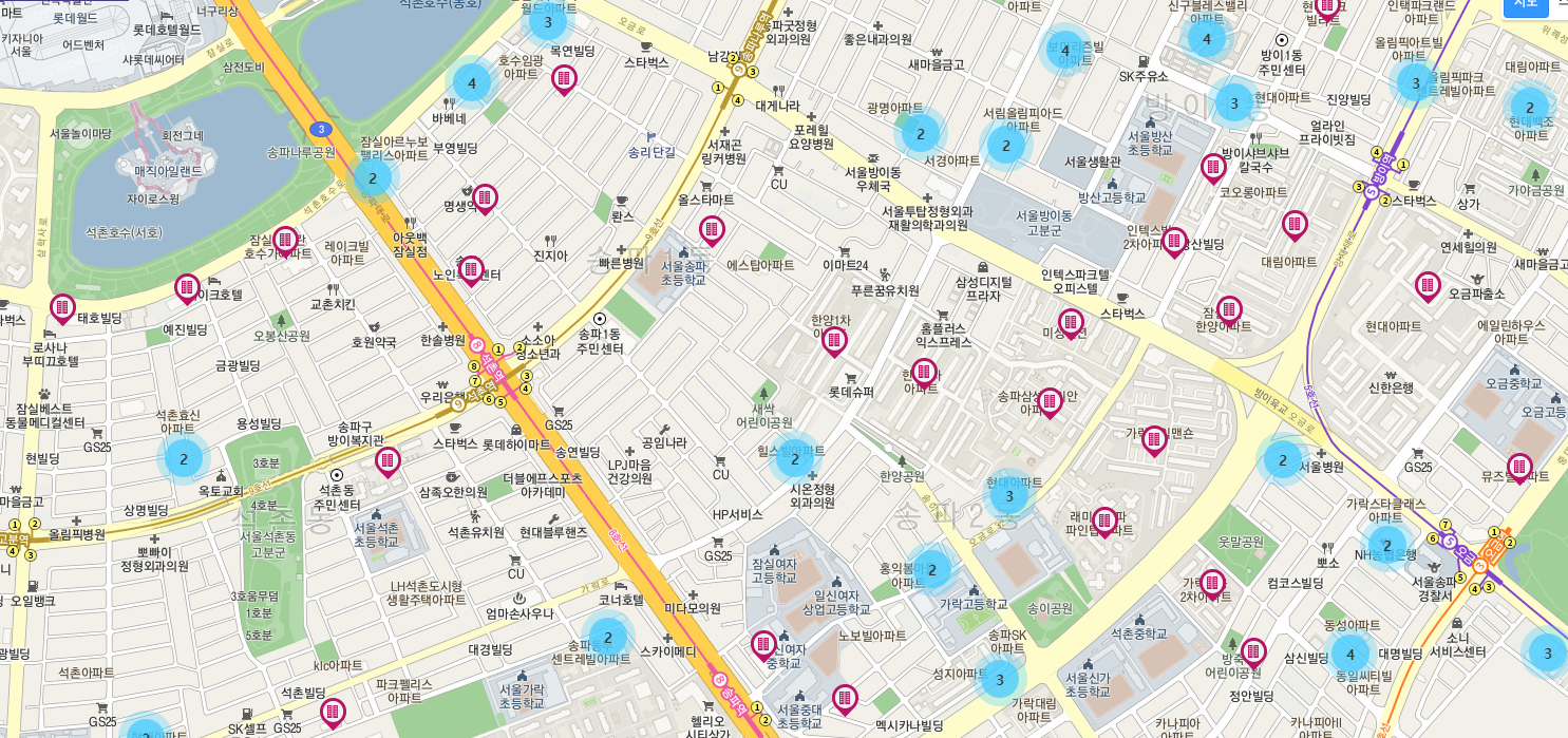 서울특별시 송파구를 선택후 검색을 하면 지도가 서울특별시 송파구로 이동이 됩니다.
