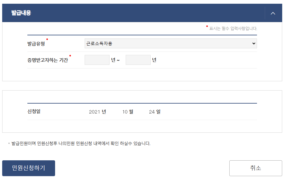 마지막으로 발급 유형, 증명받고자하는 기간을 입력 선택 후 아래쪽에 보이는 민원신청하기 버튼을 클릭하시면 됩니다.