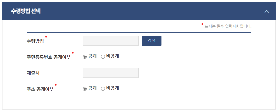 그리고 수령방법, 주민등록번호 공개여부, 주소 공개여부를 선택 하여야 합니다.