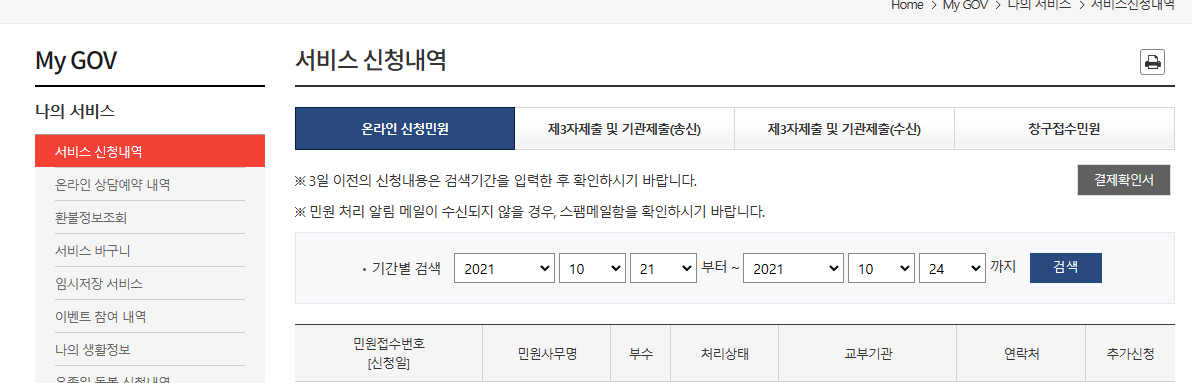 신청을 했으니 이제 프린터로 출력을 하여야 하는데 프린터로 출력은 서비스 신청내역에서 하실 수 있습니다.