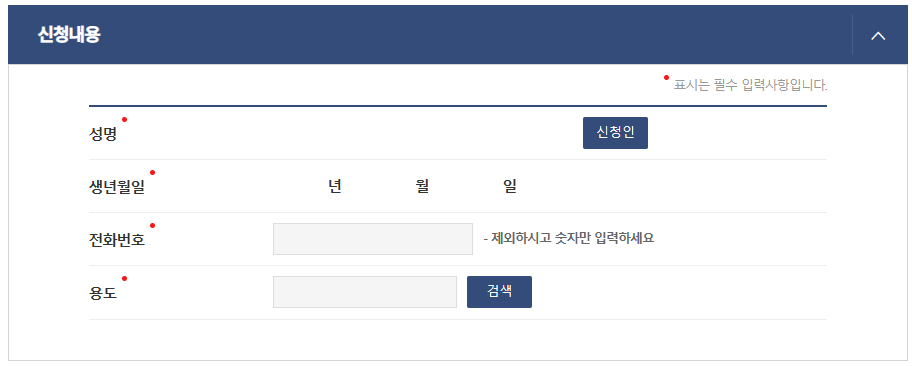 성명 생년월일은 입력이 되어있으실텐데 전화번호, 용도만 입력 하시면 됩니다.