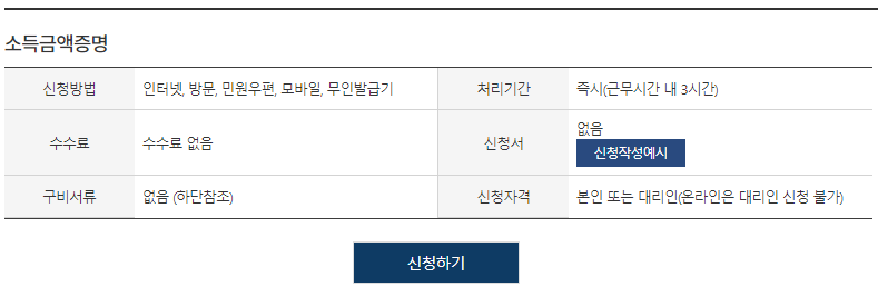 클릭하시면 소득금액 증명서에 관환 여러가지 정보를 확인하실 수 있습니다. 읽어보셔도되는데 읽어보지 않으실 분들은 바로 신청하기 버튼을 클릭하시기 바랍니다.